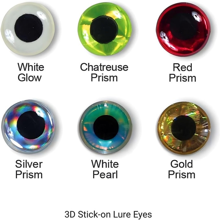 - Three-dimensional molded plastic self-adhesive fishing lure eyes may be applied to smooth and FLAT surfaces. Add lifelike 3-D eyes to your lures for an incredible realistic effect. All eyes have a black center. 100 eyes per Pack