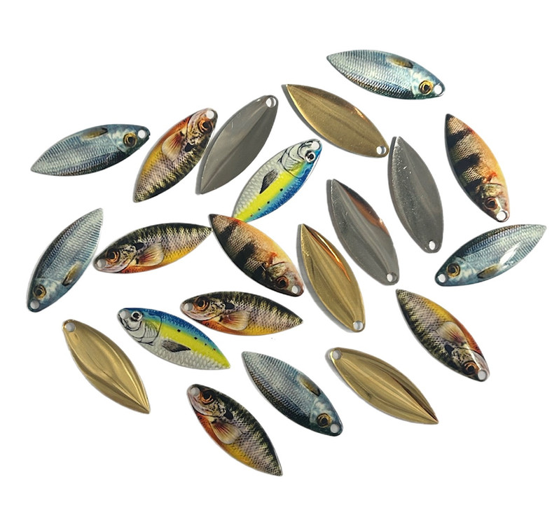 - Enhance your lure crafting with our premium 20-pack of US-made custom-colored spinner blades featuring lifelike fish images on Willow spinners. Perfect for DIY bass lures, spinner baits, walleye jigs, and more!!