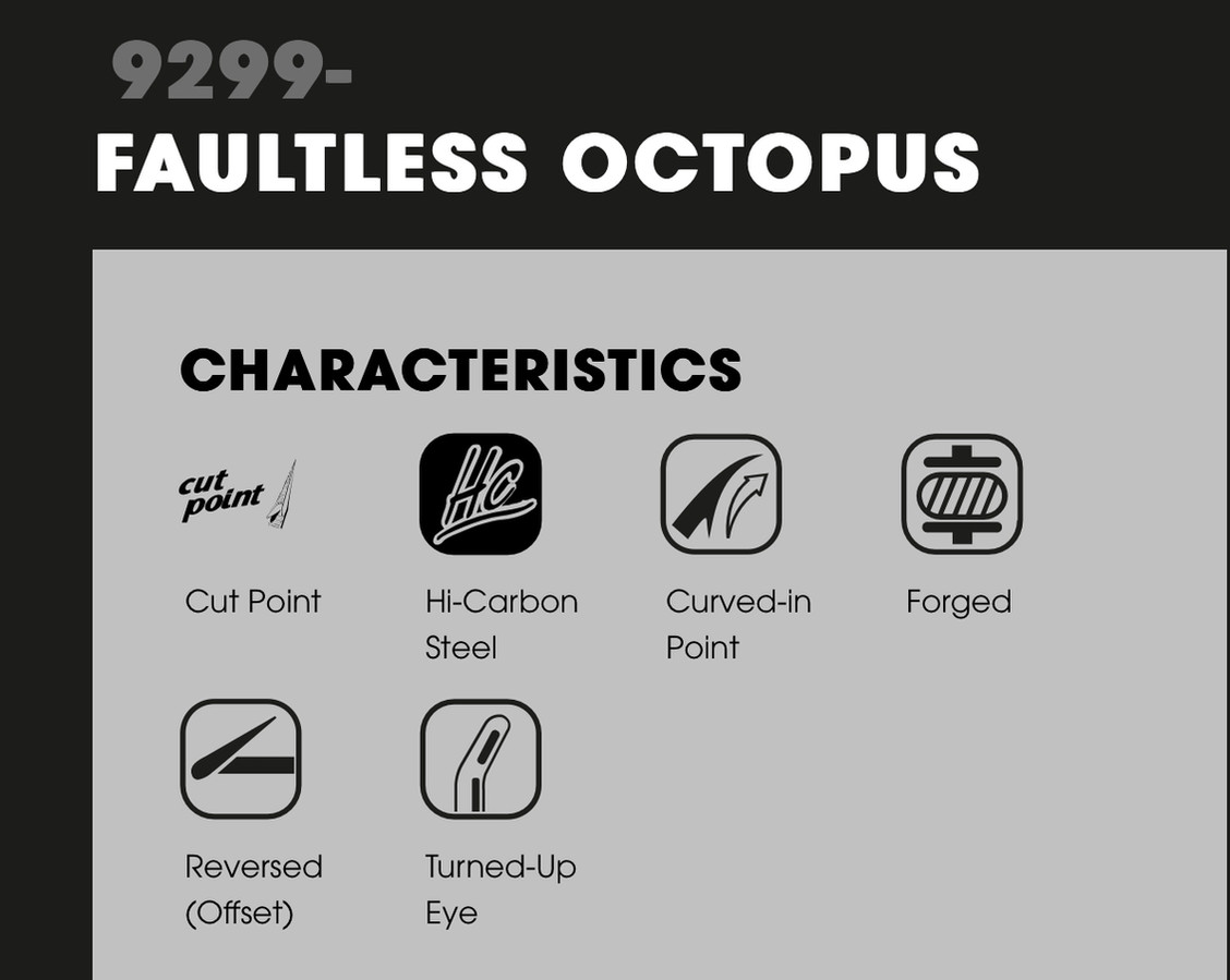 VMC 9299 Octopus Hooks were designed to be the most versatile hook in any tackle box. These hooks offer both fresh and saltwater live bait fishermen a turned out hook eye that allows the hook shank to sit directly in-line with the leader at all times when tied with a snell knot. Forged from a high-carbon steel with a unique saltwater resistant Perma Steel finish, VMC Octopus Hooks feature a razor sharp cutting point that is slightly offset to increase hook-up percentage.