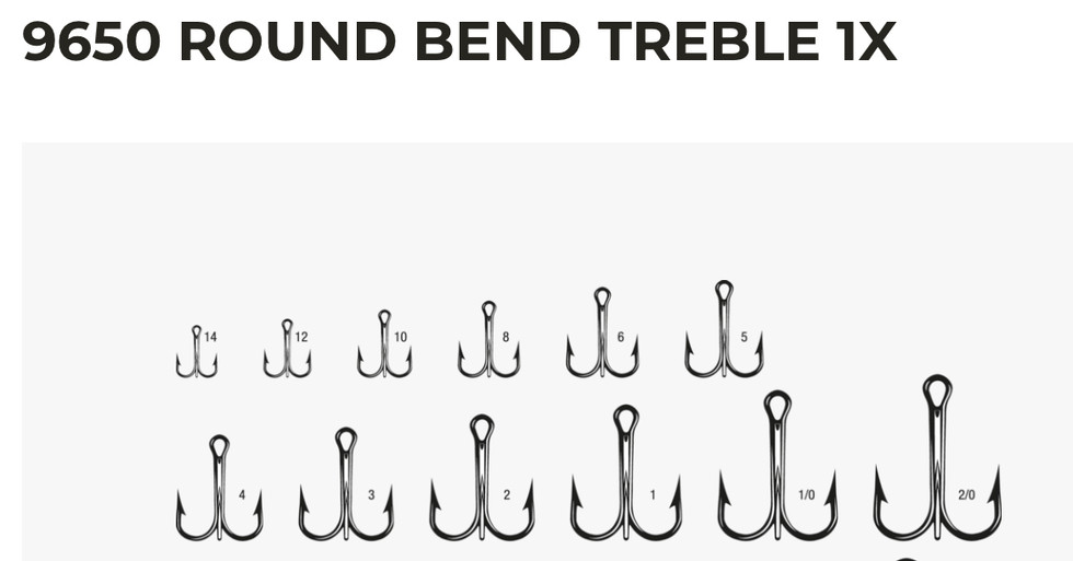 - Rapala 9650 ROUND BEND TREBLE 1X #8 - 2/0 Size in 25, 50 and 100 Packs - VMC 9650 Black Nickle Treble Hook